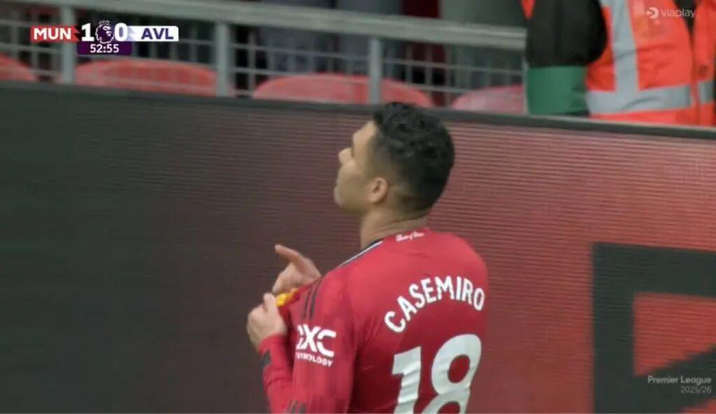 姆贝莫的射门博得右路角球,B费主罚开出,卡塞米罗前点高高跃起甩头攻门,皮球应声入网,曼联1-0打破僵局。这是34岁的「胖虎」本赛季的第7粒进球,追平加盟后第一个赛季的进球数;这也是他第6次角球得分,而且与B费形成了默契的配合,「BC连线」已经5次取得入球。